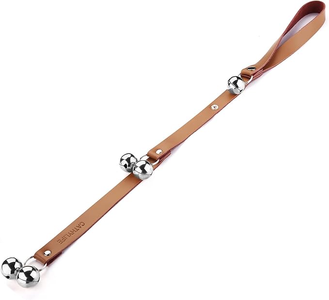 - If you do not want to install a dog door on your own door, this puppy bell will be a good choice, it is easy to use, just hang on the doorknob to start interaction with your puppy. Beautiful leather and bell can also serve as a nice decoration, if hanging the bell on the door handle causes inconvenience, you can buy our hook - B08RY66WD2, stick it in a suitable location to hang the bell.