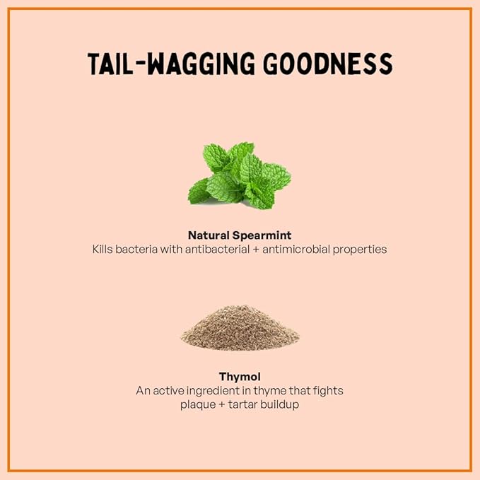 - FRESHENS BREATH & PROMOTES HEALTHY GUMS: Crafted with thymol and a breath-freshening mint flavor that helps promote oral hygiene and freshens breath with it's highly soluble ingredients. It helps remove the plaque and bacteria from your pet's mouth - eliminating bad breath and preventing gum disease. Natural thymol and spearmint provide antioxidants, antimicrobial & antibacterial benefits, this natural oral aid helps kill the bacteria in your pet's mouth that is responsible for the bad breath.