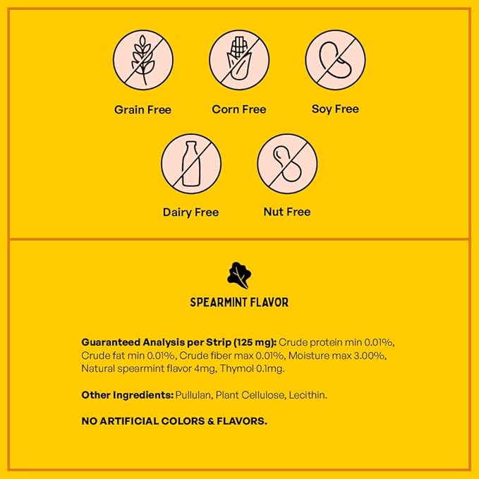 - EASY TO ADMINISTER- NO BRUSHING REQUIRED! These Natural Spearment oral strips will have your pet wagging it's tail come time to consume. No need to gag your pet with large capsules or tablets. Simply place a strip on your pet's tongue and let it dissolve. You can also dissolve a strip in the water bowl or simply mix it into their food. Avoid any pain or stress to your furry friends!"