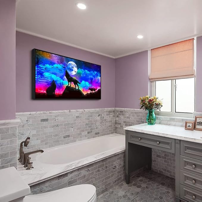 Framed Canvas Wolf Landscape Painting Canvas Wall Art For Living Room Bathroom Wall Decor For Bedroom Kitchen Artwork Canvas Art Prints Modern Office Home Decorations Blue Starry Sky Hang Pictures