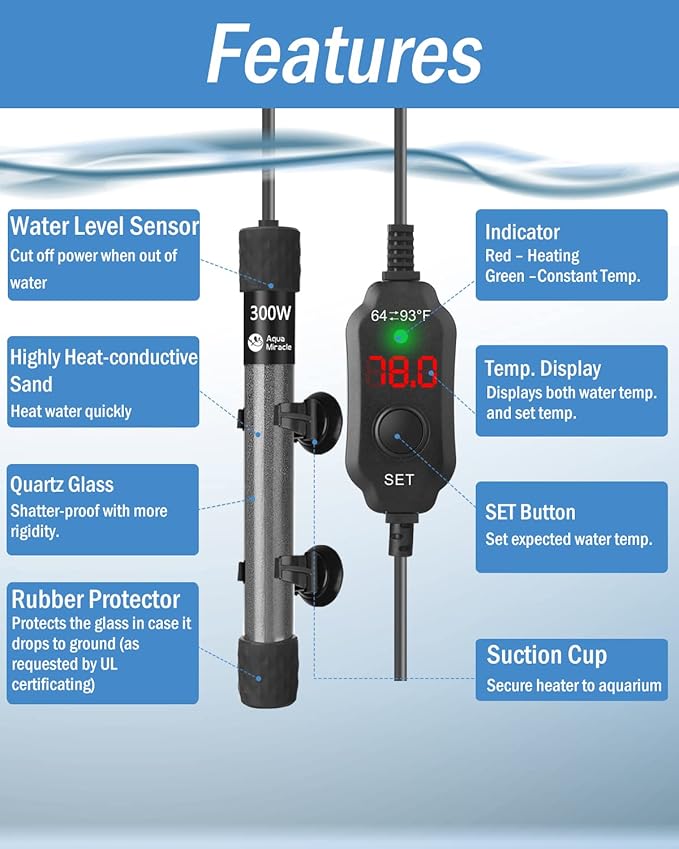 AquaMiracle Adjustable 300W Aquarium Heater Submersible Fish Tank Heater Super Short Aquarium Heater with LED Digital Display Thermostat, for Tanks 40-60 Gallons