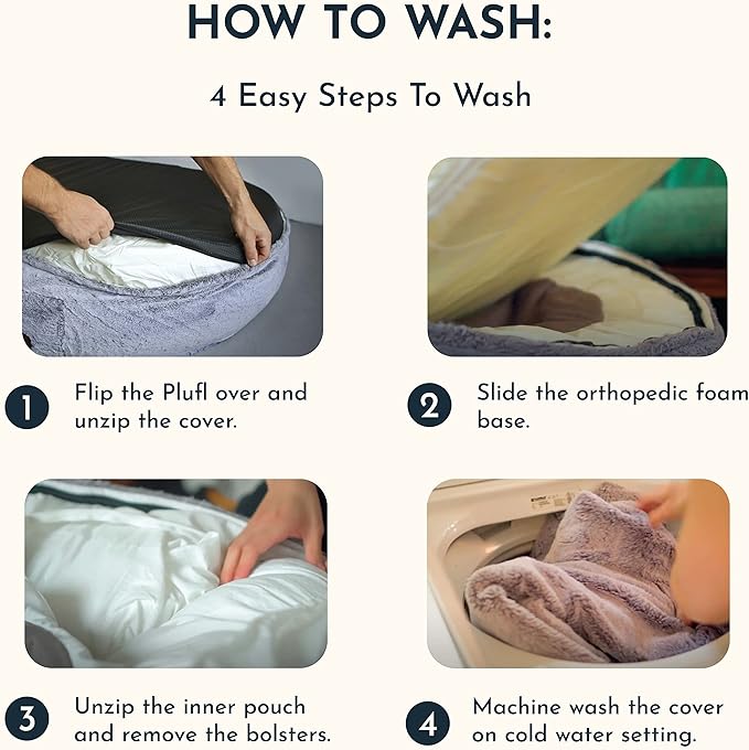 - ππππ ππππ: Caring for your Plufl couldnβt be easier. With a 100% machine washable exterior, simply unzip, remove the base mattress and support bolsters, and toss the cover in your machine on cold. Be sure to hang dry to keep the vegan faux fur looking fresh andβ¦ well, Plufl-y!