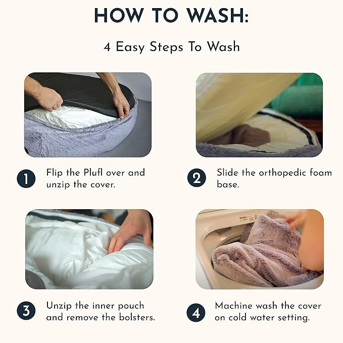 - ππππ ππππ: Caring for your Plufl couldnβt be easier. With a 100% machine washable exterior, simply unzip, remove the base mattress and support bolsters, and toss the cover in your machine on cold. Be sure to hang dry to keep the vegan faux fur looking fresh andβ¦ well, Plufl-y!