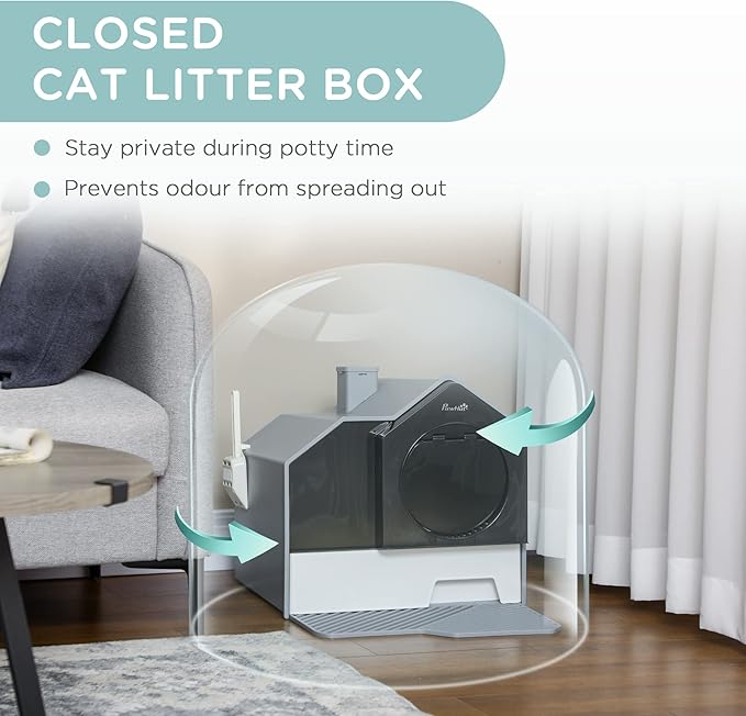 PawHut Hooded Cat Litter Box with Kitty Litter Mat, Kitty Litter Pan with Odor Control, Easy-Clean Pull-Out Drawer, Handle, Scoop, Gray