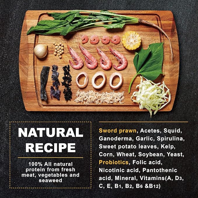 - High Palatability : Sword Prawn Flavor - A blend of wild sword prawns, fresh squids, vegetables and seaweed. A perfect 7:3 meat/vegetable protein ratio even the pickiest bottom feeding fish can’t resist. Quickly soften with water and does not disintegrate easily. Suitable for bottom feeder that use live bait as their staple food