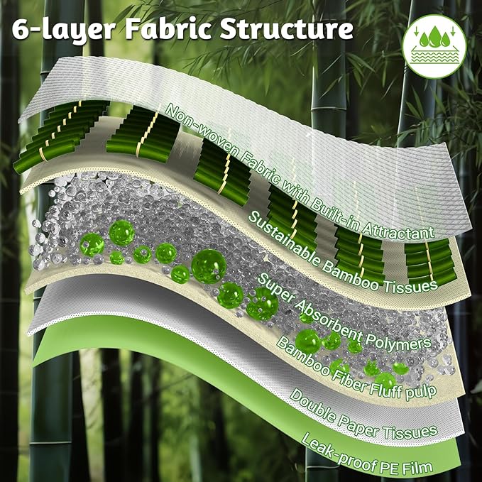 - 6-Layer Absorbency & Leak Proof: features a six-layer structure with high-performance SAPs to absorb up to 8-11 cups of liquid; a PE film layer at the bottom prevents leaks and maintains a clean environment