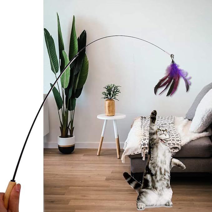 - [With bells] Cat feather replacement not only has an eye-hook connector for easy replacement, fishing pole cat toy can be hung on doorknobs, chairs, cat climbing frames, etc. cat toy worm also has a bell that can attract the cat's attention, keep survival alert and exercise