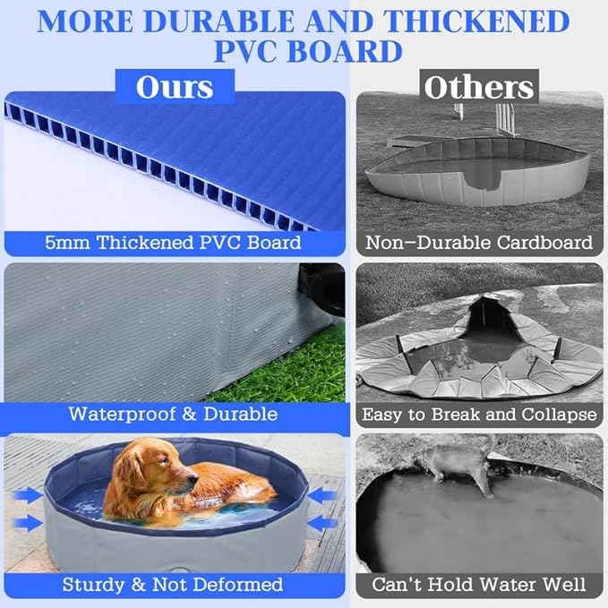 - 【High-quality Material, Sturdy Durable】 - The dog pool / kids pool is made of high-density fiberboard and high-quality PVC material. Strong enough and uneasy to collapse and deform. The bottom is made of abrasion resistant non-slip textured fabric, non-toxic and waterproof, perfect water retention. It also can prevent your pets from slipping when they jump around in the bath pool. Tips: Please trim your puppy's nails to prevent damage or leakage to the inner wall.