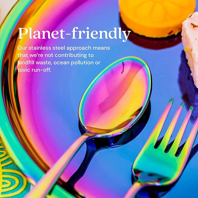 - Safe and Non Toxic — Ahimsa kids silverware is crafted from high-quality 304 18/8 food-grade stainless steel. Free from BPA, PVC, phthalates, melamine, and lead, ensuring no harmful chemicals leach into your food. These rainbow spoons and forks are perfect for health-conscious parents who prioritize safety.