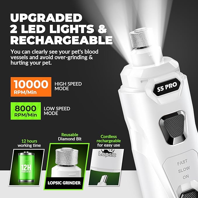 - 【Improved Precision: 2 LED Lights & Adjustable Speeds】: LOPSIC dog nail grinder for dogs features 2 LED lights that offer clear visibility of the quick, ensuring precise and safe nail trimming for your pets. The adjustable speeds(8,000 RPM to 10,000 RPM) of dog nail trimmers can adapt to small, medium and large pets nail trimming needs. When using the dog nail trimmers at the proper speed, pet nails of different hardness can be efficiently ground