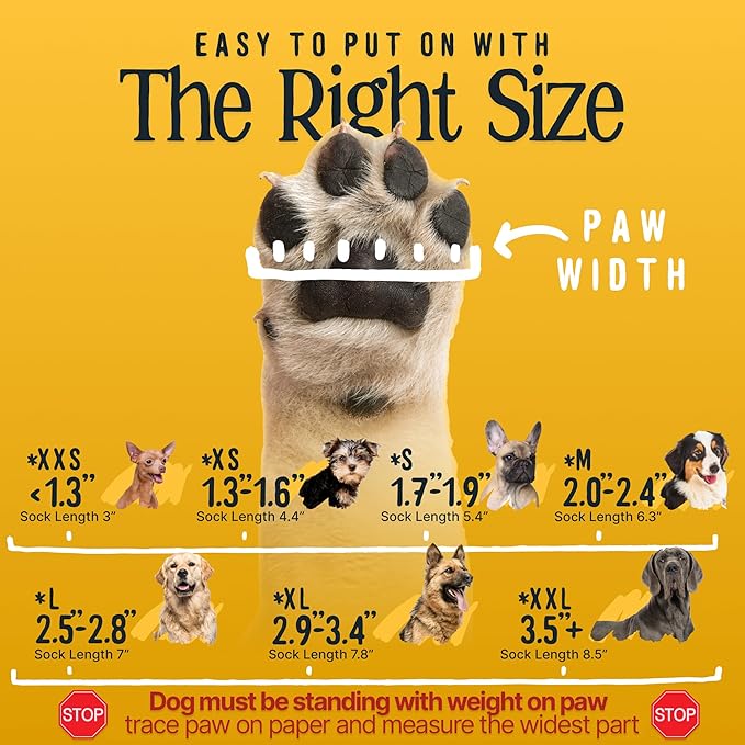 - XS fits paws 1.3" - 1.6". Measure while dog is standing with weight on paw. Includes 4 dog grip socks. Snug fit is normal—extra grip makes them stiffer than other socks but provides better traction.