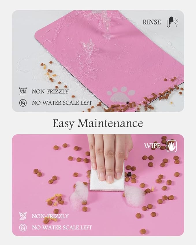 - Keep Clean & No Stains:No marks will be left when food and water are dropped on the dog food mat. Unlike traditional silicone pet feeding mats, our pet feeding mat for food and water won't pick up pet hair or dust, and won't build up tough-to-clean limescale, keeping the dog bowl mat as good as new forever.