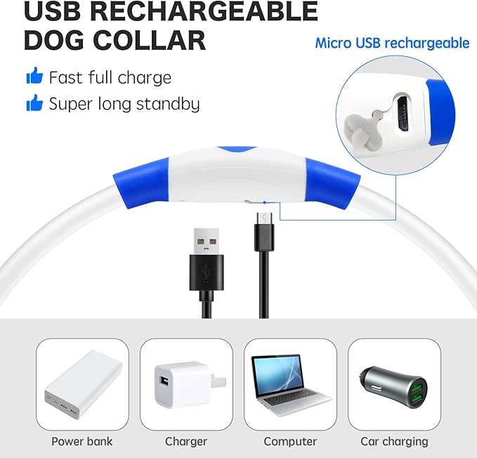 - ★Efficient and Convenient Lighting for Your Pet with the Rechargeable LED Dog Collar: The LED Dog Collar features multiple flash modes, including steady glow, quick flash, slow flash, and off, offering versatile use. The collar light is conveniently recharged with a mini USB cable after use, making it an energy-saving and convenient option for your pet's nighttime adventures.