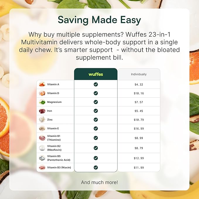 - Blend of vitamins and minerals: Our product contains Zinc, Vitamin A, L-Taurine, Vitamin C, Iron, Folic Acid, Vitamin B12, Vitamin D3, ,Wild Alaskan Salmon Oil as a source of Omega-3 fatty acids and much more. Wuffes 23-in-1 Multivitamin is a great addition to any diet and helps to provide a strong nutritional foundation that minimizes the incidence of deficiencies.