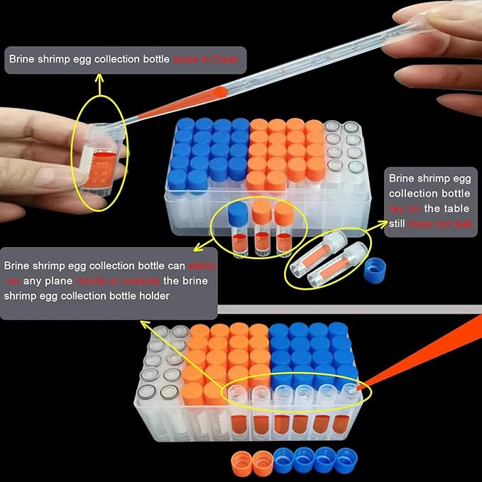 - 2. Convenient arrangement: 50pcs 1.8ml brine shrimp egg collection bottles with flat bottom can stand independently on the table, or can be neatly arranged in the compartmentalized storage box equipped with the set, which is convenient for stacking and storing when freezing.