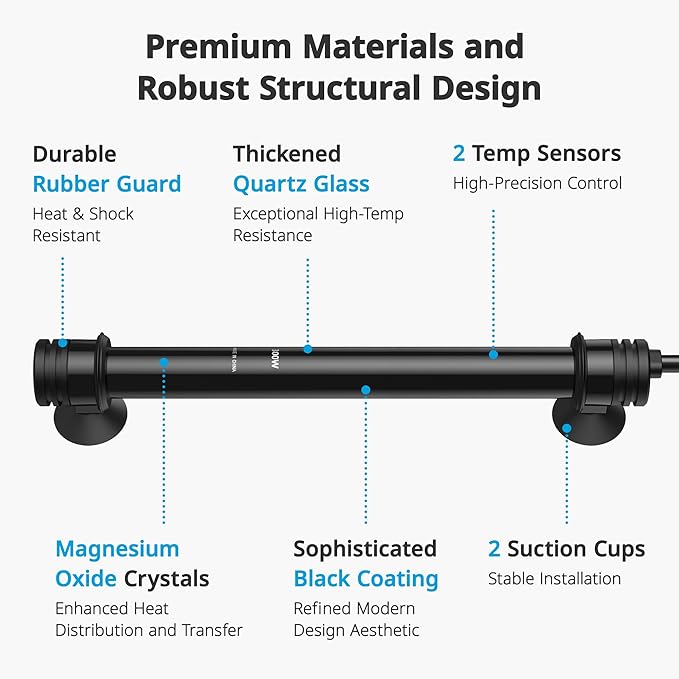- Easy Installation: Includes suction cups for secure attachment to the aquarium wall. It is recommended that the heater be fully immersed in water and placed in an area with good water circulation to minimize temperature error