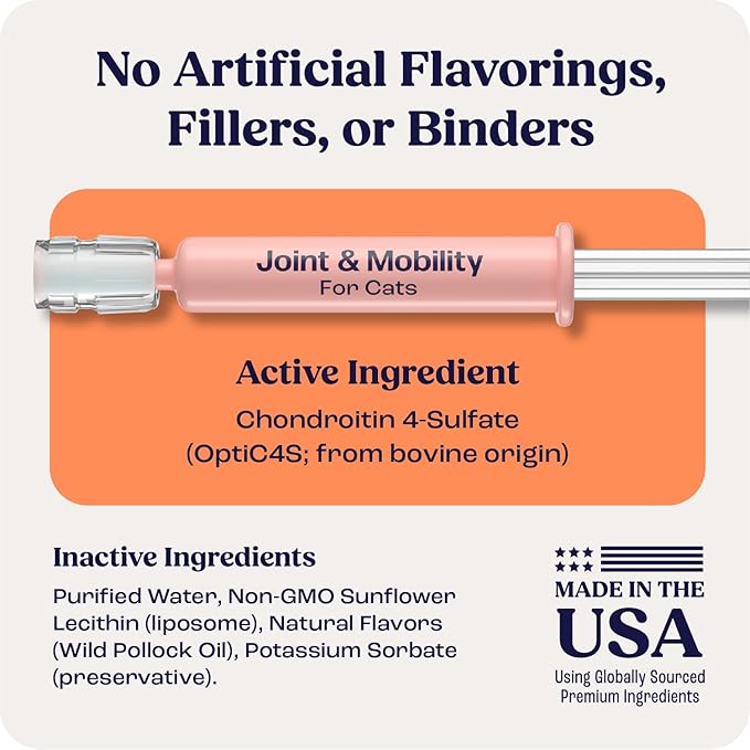 - UNIQUE FORMULA. UNRIVALED RESULTS: 100% natural, drug-free, and without CBD. Our powerful pharmaceutical-grade chondroitin 4-sulfate formulation offers unrivaled joint repair benefits without needing aspirin or pain masking medications. A superior anti-inflammatory relief medication. A superior anti-inflammatory relief medication. In one tasty, weekly dose, Joint & Mobility Feline Relief Solution is the supplement all cats love.*