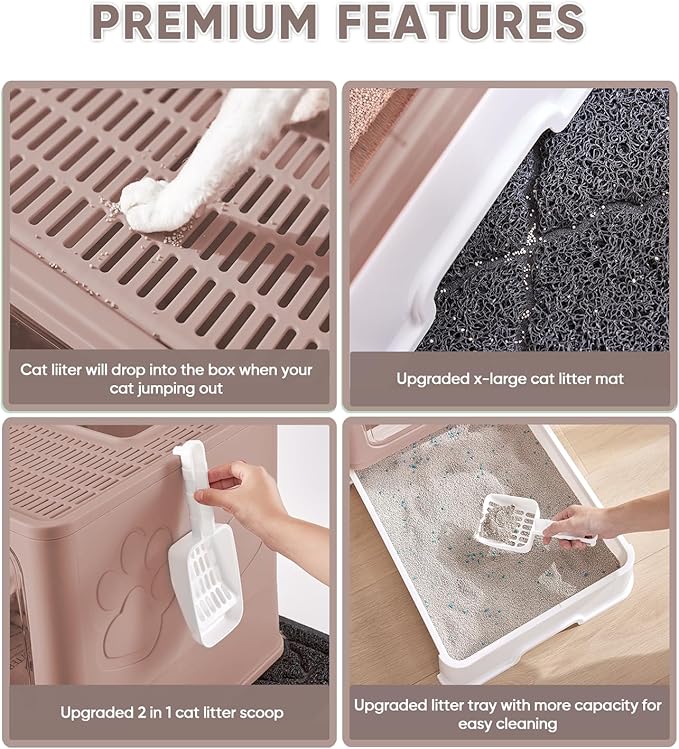 Cat Litter Box with X-Large Litter Mat and Scoop, Large Foldable Litter Box with Lid, Enclosed Kitty Box,Front Top Entry Exit, Odor Control Easy to Clean (Upgrade Coffee)