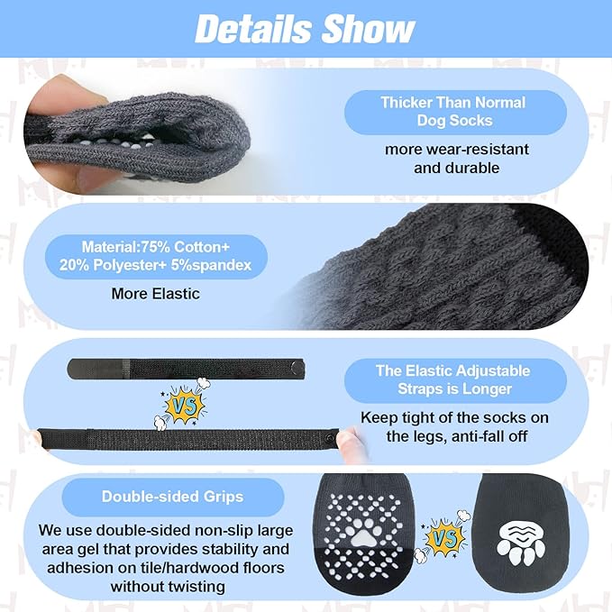- Anti-Fall Off: The socks are long socks, which are especially suitable for long-legged pets and are not easy to shed. You can see an adjustable and removable belt on each dog sock. You can use it to adjust the tightness of your dog's socks to prevent your baby from dropping them when walking or running.