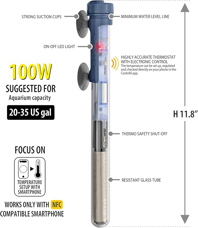 Sicce Scuba 100 Watt Aquarium Fish Tank Heater Smartphone Controlled via NFC Contactless App Adjustable | 100W Submersible for Marine Saltwater and Freshwater | Run Dry Protection