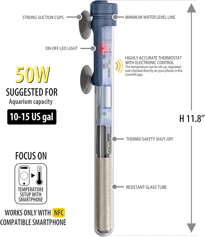 Sicce Scuba 50 Watt Aquarium Fish Tank Heater Smartphone Controlled via NFC Contactless App Adjustable | 50W Submersible for Marine Saltwater and Freshwater | Run Dry Protection