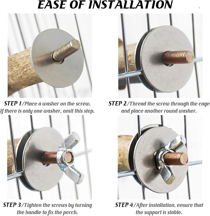 - [EASY TO INSTALL] Each perch branch is equipped with a metal wing nut and built-in bolts, just clip the bracket or platform to the bird cage with two pieces of metal washers and tighten them with screws to fix the bracket and platform stably to the bird cage, no other tools are needed. You can use these perches to create a cozy space for your pet bird, or create an exclusive recreational exercise space where your pet can play