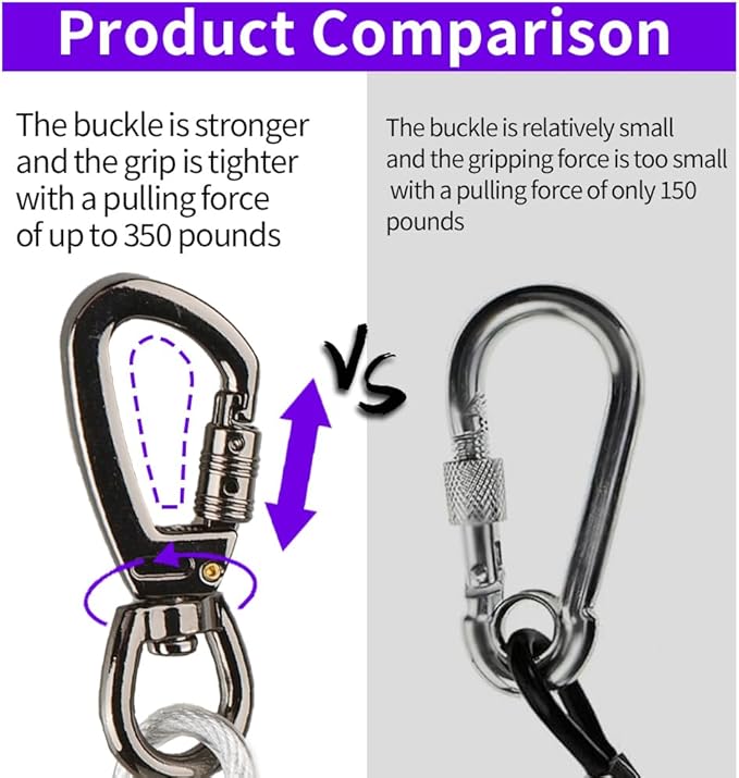 - Upgrade Heavy Duty Buckle & 360° Tangle Free-dog cable use heavy duty locking carabiner, stronger and more durable, with a 360° smooth rotation axis, your dog can run freely without getting tangled.