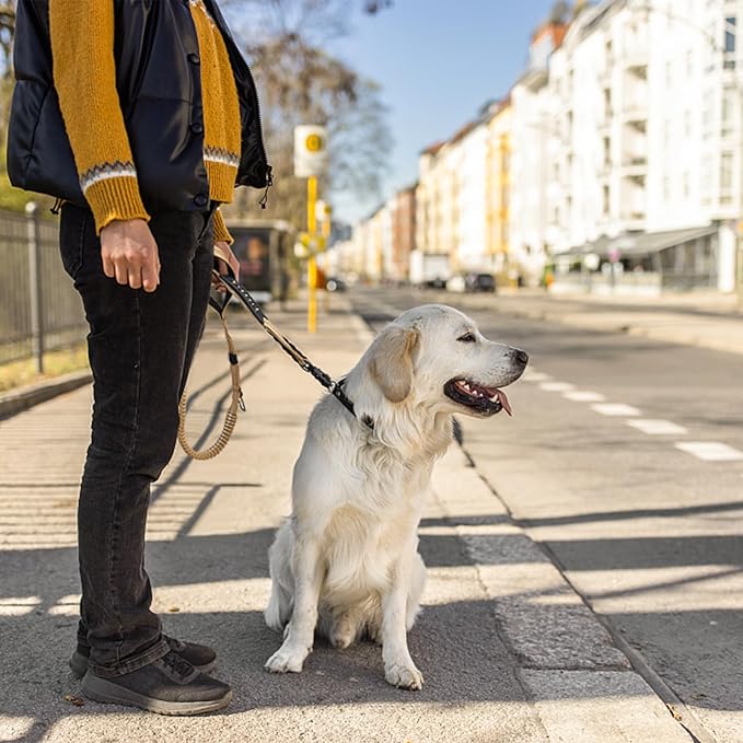 - 【🐕Multiple Safety】Three high reflective lines are added to the throughout the dog leashes for large dogs heavy duty to ensure the safety of you and your dog at night. tan tactical dog leash Designed with 1 seatbelt buckle to ensure the safety of you and your dog while driving.