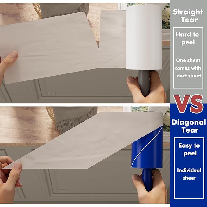 - Easy To Tear: The lint roller papers take new upgraded design, the paper sheet has two color which one layer is white and another is blue. You can easily find where to peel off.