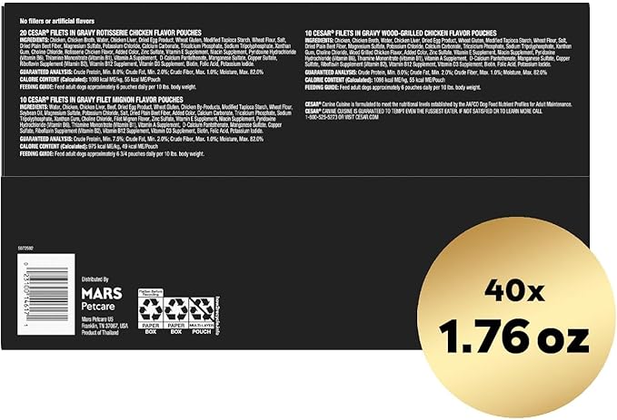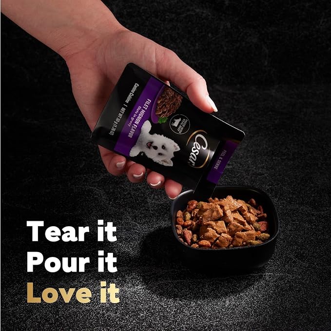 Cesar Filets in Gravy Wet Dog Food Filet Mignon Flavor, Rotisserie Chicken Flavor, and Wood-Grilled Chicken Flavor Variety Pack, 1.76 oz. Mini-Pouches (40 Count, Pack of 1)