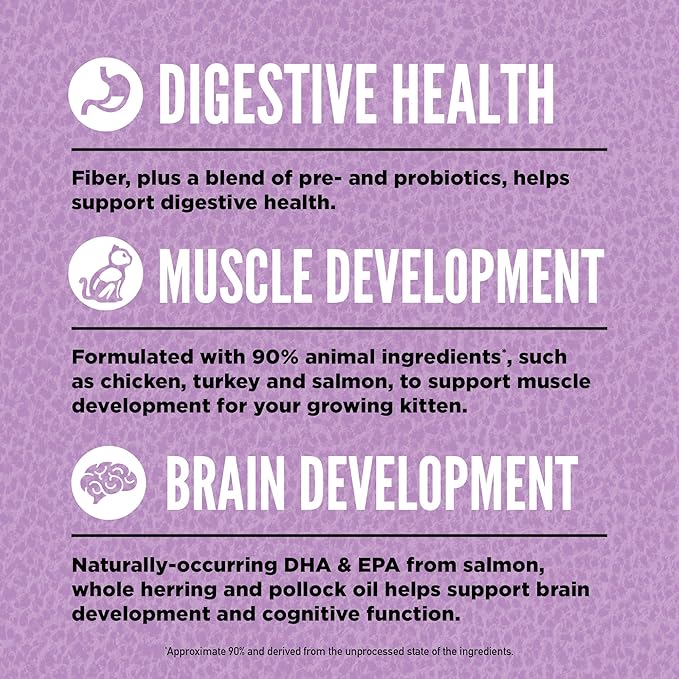 - ORIJEN dry cat food specifically designed to provide biologically appropriate nutrition to help support your growing kitten's muscle development, digestion, brain development and cognitive function
