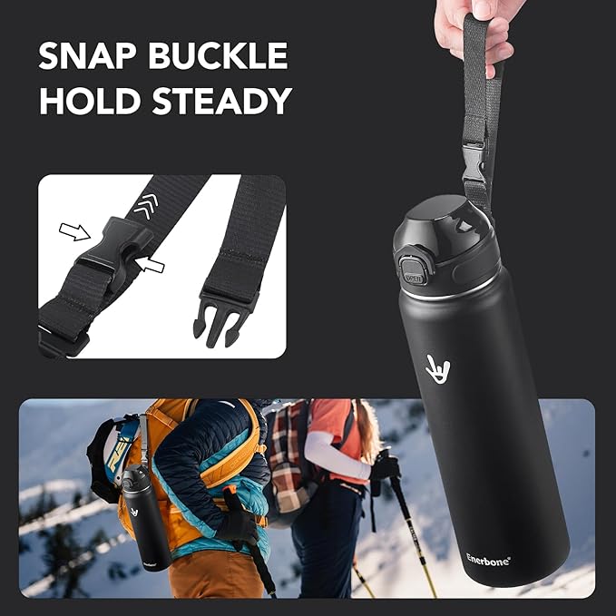 Enerbone 32 oz Insulated Water Bottle, Stainless Steel Bottle with Carrying Strap, Double-Wall Vacuum Insulation Design, Leakproof Sports Bottle with Straw, Keep Drinks Cold or Hot for Hours