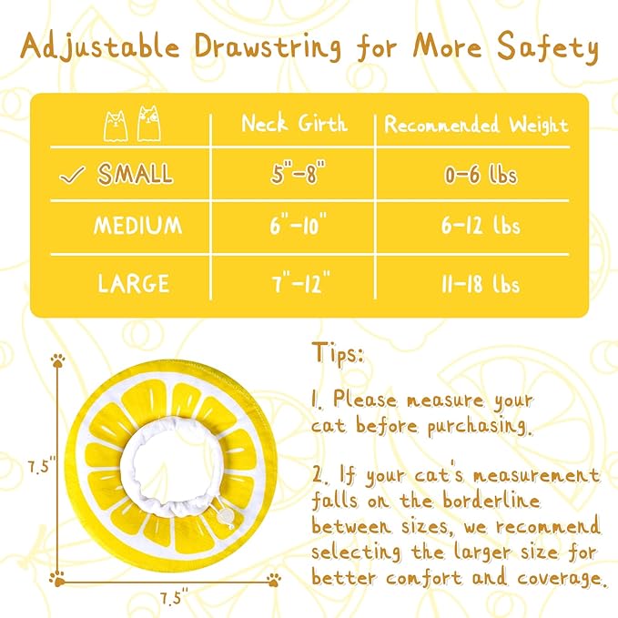 - 【SUITABLE FOR ALL SIZE OF CATS】 Soft cone for cats has an adjustable inner, so you can make a comfortable fit for your cat. By adjusting the stretchy string, cat won’t slip out of it that easily. Available in two sizes. Size S (7.5"×7.5"×1.8") suitable for cats with a neck circumference of 5-8 inches (under 7 pounds cats recommended).