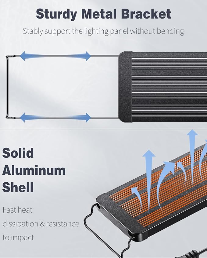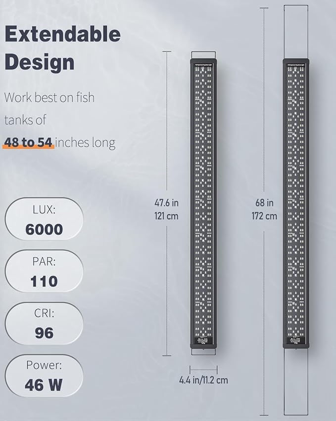 - For 48" to 54" Tanks: With an extendable bracket (min length: up to 47.6"; max length: up to 68"), the LED aquarium light always stays steady on the fish tank. Work best on tanks of 48 to 54 inches long.