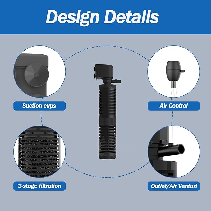 - SATETY MOTOR - This internal aquarium filter has an fully epoxy-sealed motor, tested with super high voltage during manufacturing to avoid electricity leakage.