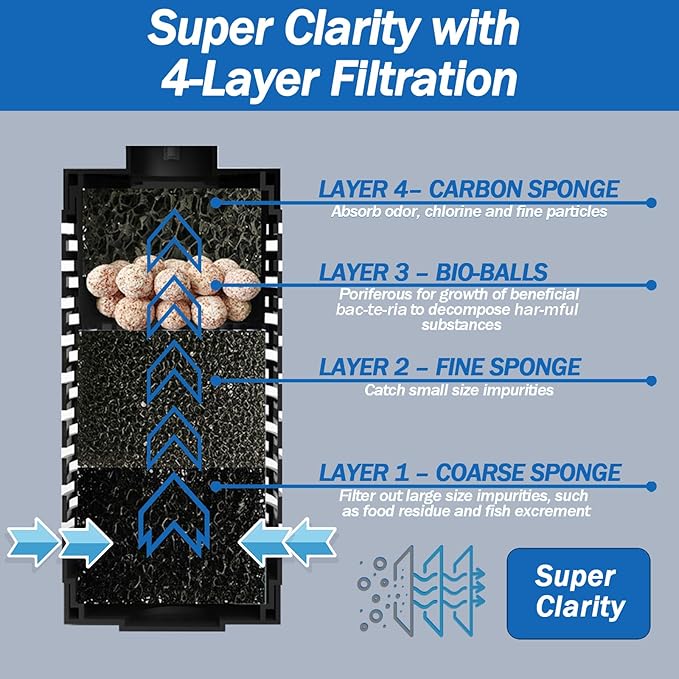 - TRUE 4-STAGE FILTRATION - Featuring 3 sponge blocks and bio-balls for true 4-stage filtration, including COARSE SPONGE to capture large impurities, FINE SPONGE to catch small particles, Bio-balls for cultivation of beneficial bac-te-ria for the environment in the aquarium, and CARBONIZED SPONGE to absorb odors and chlorine.