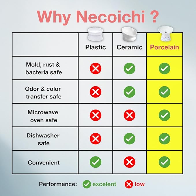 - Our first tilted bowl is joining Necoichi’s Raised Food Bowl lineup! Food stays centered, and the tilted lip makes it easier for your cat to eat without whisker or neck fatigue from the perfect height.