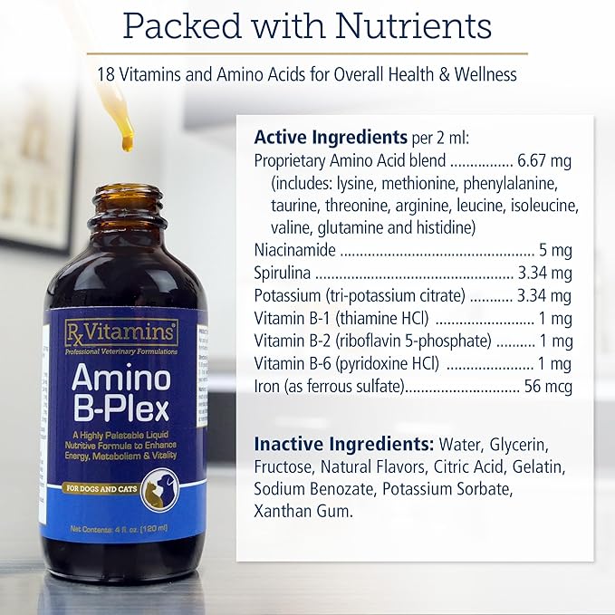 - Quality Pet Vitamins & Supplements: Rx Vitamins' Amino B Plex prioritizes dog health and cat vitamin needs with its premium ingredients and formulation. Designed to support overall wellness in pets, it's a reliable choice for pet owners seeking high-quality supplementation for their beloved companions.