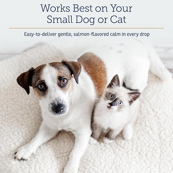 - Liquid Formula Ideal For Small Dogs & Cats: This tasty, salmon-flavored liquid is designed to calm and soothe "difficult-to-pill" small dogs and cats.