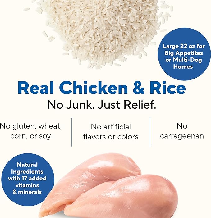 - Simple chicken and rice recipe is formulated to help calm your pup’s tummy during times of transition; also ideal for the dog prone to stomach upset. Great digestive health dog food.