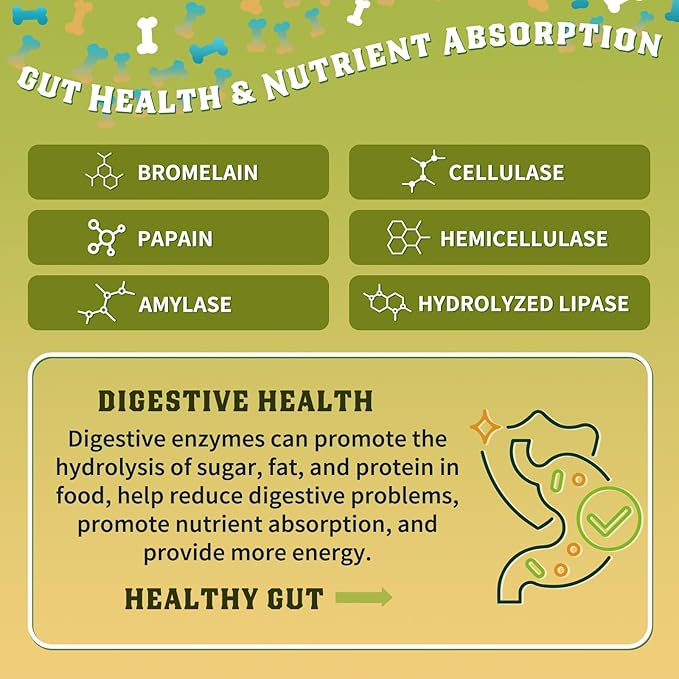 - Digestive & Skin and Coat Health: Due to the lack of digestive enzymes, food cannot be digested in time, causing some digestive issues. We have added 6 kinds of digestive enzymes, which can help to speed up and completely break down fat, protein and carbohydrates so that dogs can better absorb the nutrients they eat. Moreover, dog hip and joint supplement adds omega 5, to help our pet's itchy skin and ears, and licking paws, and support thicker, lustrous hair and beautiful coat.