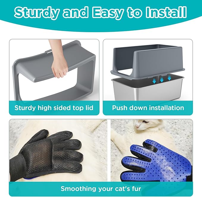 - THOUGHTFUL ACCESSORIES- The metal cat litter box lid fits perfectly without leaking litter, the locking clasp on the lid is simple, flexible and reliable, and the lid is made of high-toughness plastic that is lightweight, strong and durable.We also included an grooming glove to reduce cat hair and make the house cleaner.