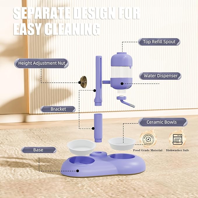 Dog Bowls with Puppy Weaning Bottles,3 in 1 Dog Bowl Set with Water Dispenser and 2 Food Grade Ceramic Bowls for Cats,Bunnies,Ferrets and Small Sized Dogs(Purple)