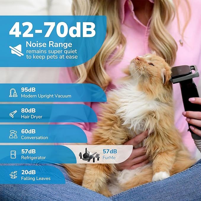 - VERSATILE DESIGN: FurMe cat & dog grooming vacuum set adapts to all fur types. It’s the ideal grooming vacuum for both cats and dogs, ensuring a smooth experience for every coat and addressing shedding needs.