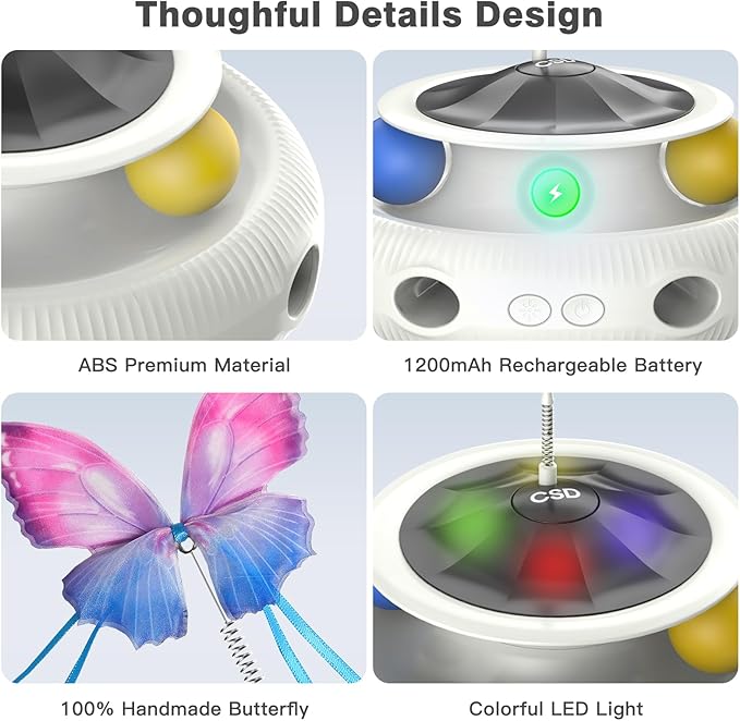 - Multi functional interactive cat toy:The cat stimulation toys for indoor cats combines with cat fluttering butterfly toy,track ball toy and random shooting feather toy,which provides cat's hunting instincts: chasing, pouncing,ambushing.And multiple play modes keep the kittens entertaining