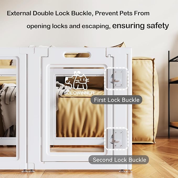 - 【NEWEST TRANSPARENT DOG PLAYPEN】SOLOWINNER clear puppy playpen broke the traditional cage fence design and adopted high-quality PE material and PET board, it's like a bright yard, more beautiful and atmospheric, easy clean, which makes your furry friend no longer anxious and feel like live in prison, never worry about your pet stucking in the fence, besides, it's convenient for you to observe your beloved pets.
