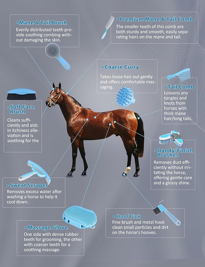 - Durable & Long-Lasting: Made from high-quality materials, the brush set features premium plastic construction with special wear-resistant treatment, ensuring exceptional durability that far surpasses ordinary brushes. These horse brushes effectively remove dirt from the horseโs coat, stimulate blood circulation, and promote natural oil production for a smooth, glossy coat.
