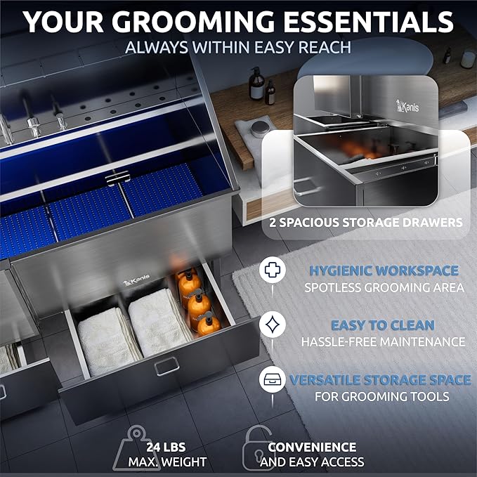 • SPACIOUS STORAGE & HYGIENIC SETUP: Two sliding drawers, each holding up to 24 lbs, provide generous space for grooming tools and accessories. Keep essentials within reach while maintaining a clean pet wash station with hassle-free upkeep