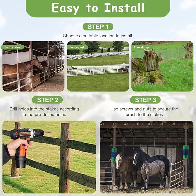 - Easy to install/disassemble, This goat brushes for grooming includes 1 brush and 4 screws. It can be installed in barns, pastures, livestock fences, horse sheds, trees, walls, or anywhere outdoors, and it is also easy to dismantle if you need to demolish it.