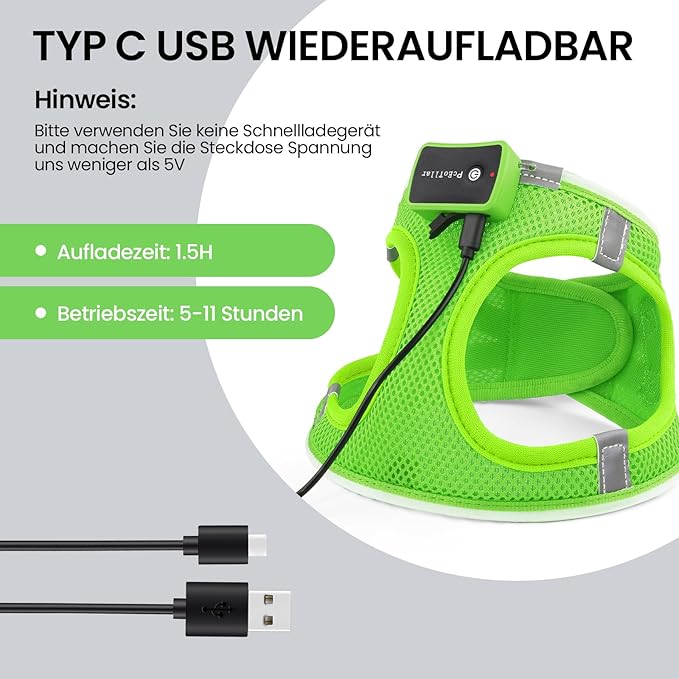 - USB Rechargeable: The LED dog harness is easy to charge using a USB cable. With a large battery capacity, it can last up to 5-11 hours on a single charge, making it perfect for long walks, hikes, and other outdoor activities.